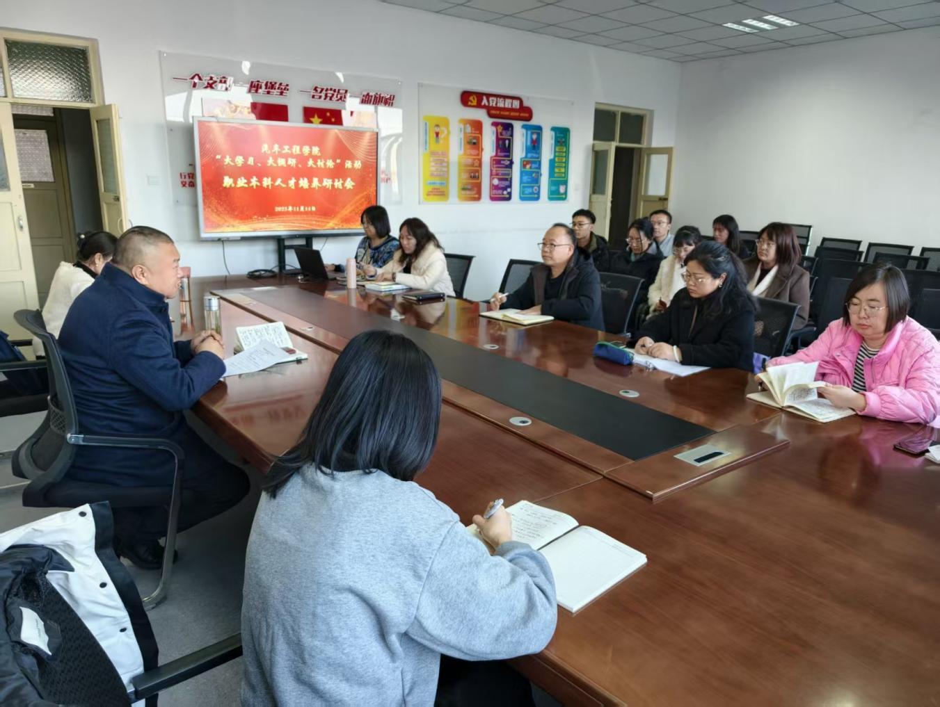 11月14日下午,汽车工程学院牵头,邀请人文基础教育学院、人工智能工程学院共同召开“大学习、大调研、大讨论”专题研讨会,聚焦职业本科专业人才培养相关内容进行研讨,凝聚跨院协同育人合力。会议由汽车工程学院党总支书记李刚主持,人文基础教育学院副院长石锐、汽车工程学院党总支副书记高原、副院长董静及汽车服务工程技术专业负责人、任课教师齐聚一堂,共商人才培养提质路径。
